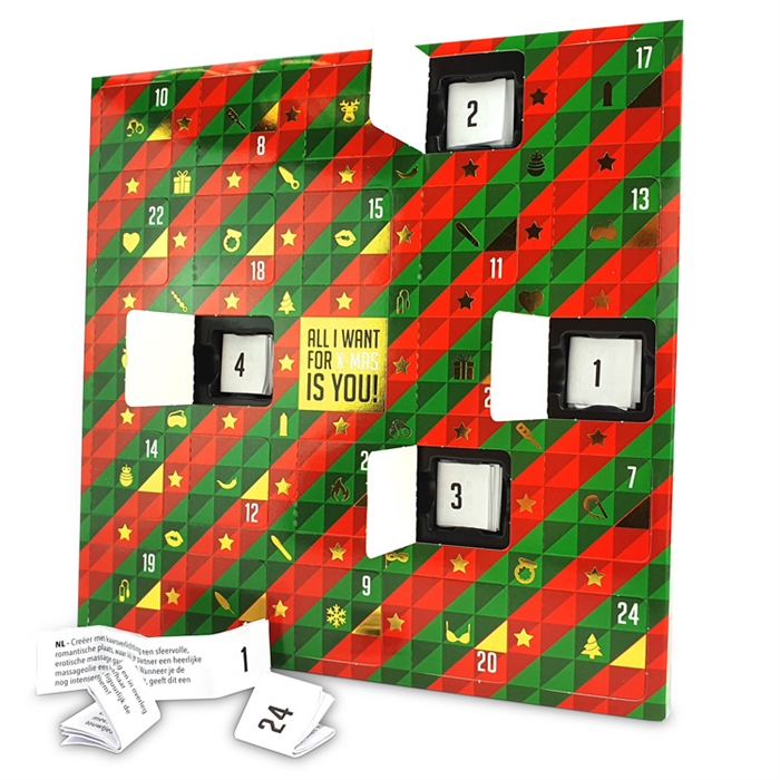 Ce calendrier de l’avent érotique est rempli de défis coquins pour vous et votre partenaire en préparation d’un Noël intime (sexy). Ouvrez une porte différente chaque jour et découvrez à quelle sauce vous allez être mangé(e). Que va-t-il vous arriver ? S’agira-t-il d’un massage érotique, d’un fantasme à partager ou d’un jeu de rôles coquin ? Surprenez votre partenaire cette année avec ce cadeau excitant qui vous procurera beaucoup de plaisir et de moments torrides à tous les deux. Et comme dans une relation épanouie, Noël c’est toute l’année, n’hésitez pas à utiliser ce calendrier de l’avent érotique à n’importe quel moment de l’année pour pimenter votre vie amoureuse.