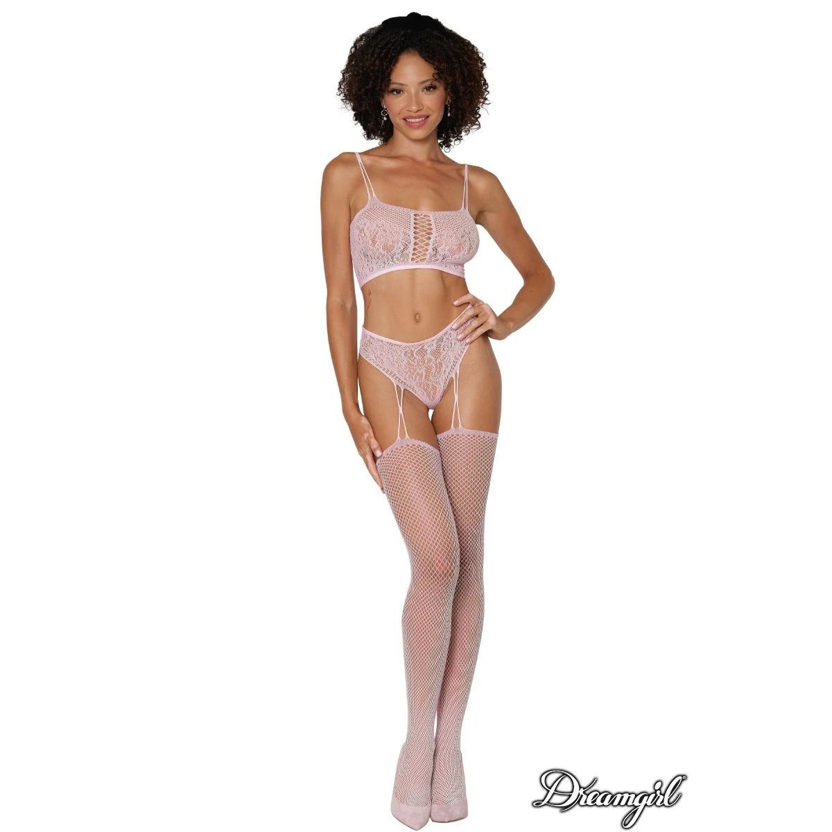 – Thong taille haute en dentelle à taille élastique avec des bas en filet comprenant une couture arrière rattachés par des jarretelles élastiques fixes