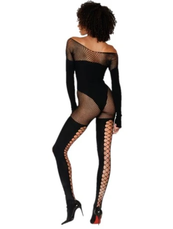 Bodystocking en filet avec un imprimé opaque ressemblant à un teddy, de longues manches comprenant des trous pour les pouces et aux jambes opaques entrouverts au lacé élastique fixe.