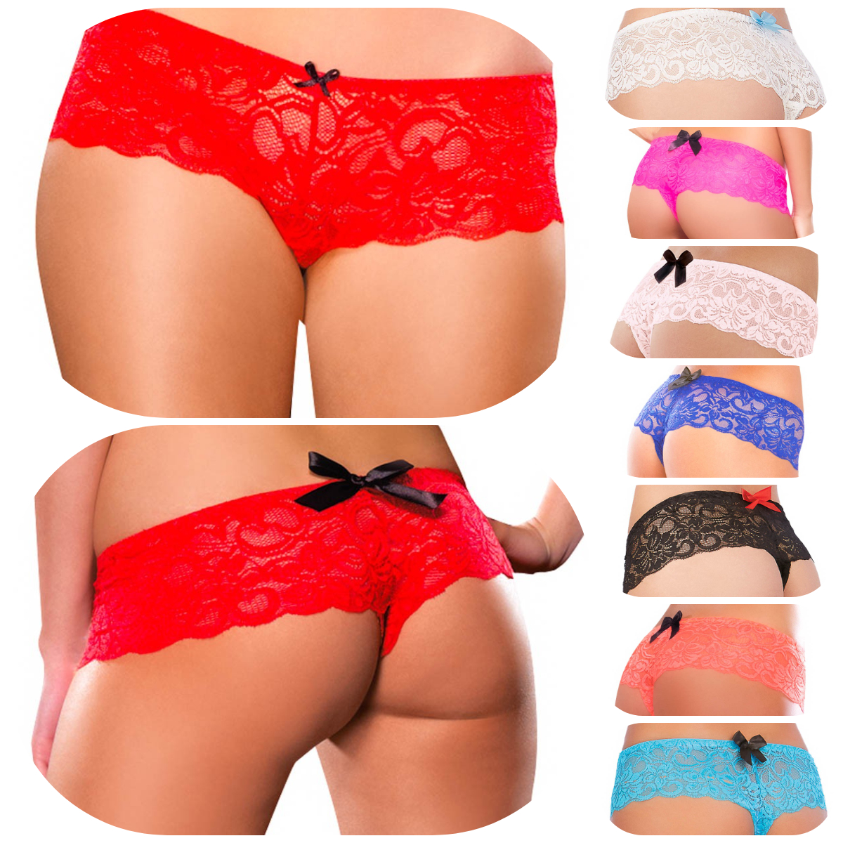 Boyshort en dentelle extensible décoré d’une boucle en satin à l’arrière et à la fourche ouverte.