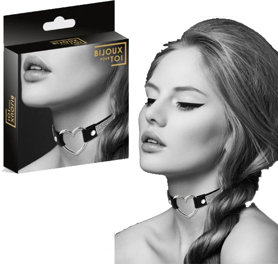 Collier ras de cou fetish Bijoux pour toi en cuir noir. Fermeture à pression. À l’avant un joli coeur couleur argent et des strass sur le coté du collier.