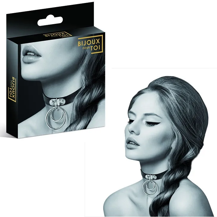 Collier ras de cou fetish Bijoux pour toi en cuir noir. Fermeture à pression. A l’avant un double anneau couleur argent pour attacher en laisse votre soumis ou votre soumise.