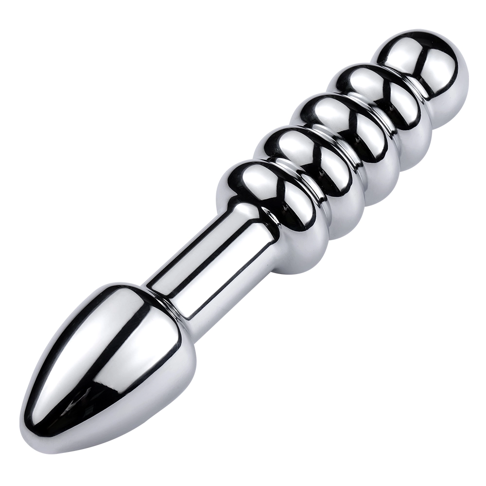 Cet élégant gode en acier est spécialement conçu pour être utilisé aux deux extrémités.