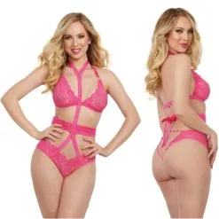 – Thong en dentelle au dos ouvert mettant les fesses à découvert avec une sangle ajustable, un harnais multi-sangles en satin attaché noué au cou et une large taille nouée au dos