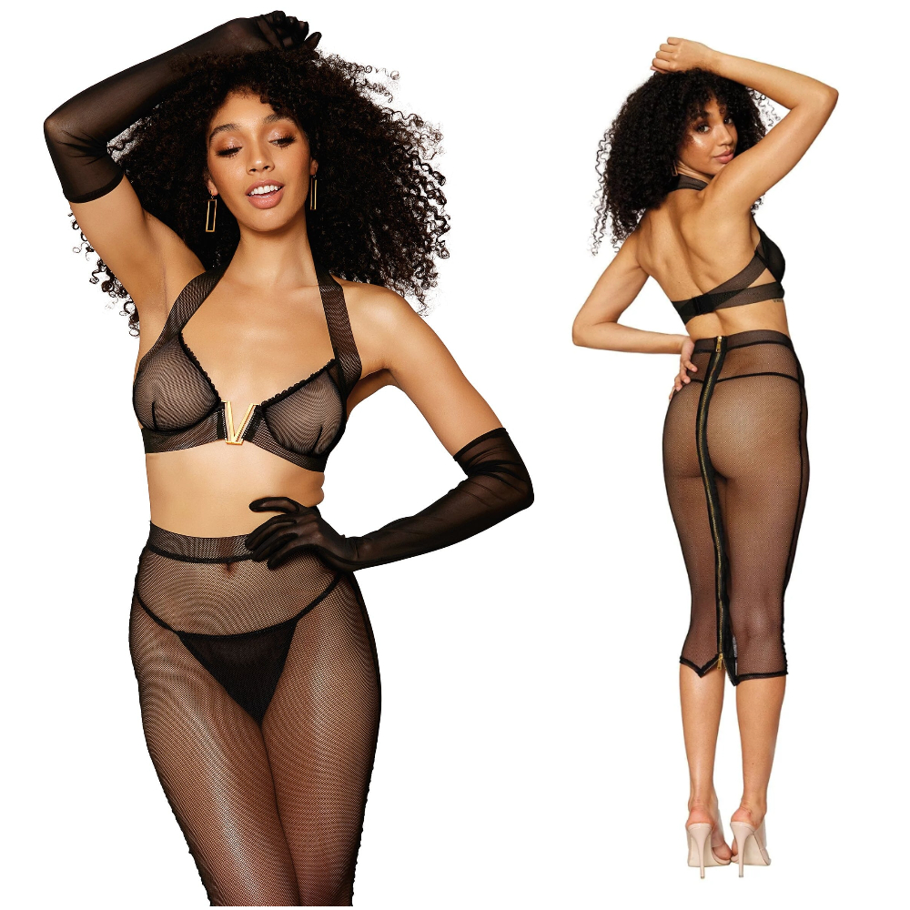 – Jupe mi-longue ajustée à taille haute en mesh semi-transparente avec une fermeture éclair dorée au dos