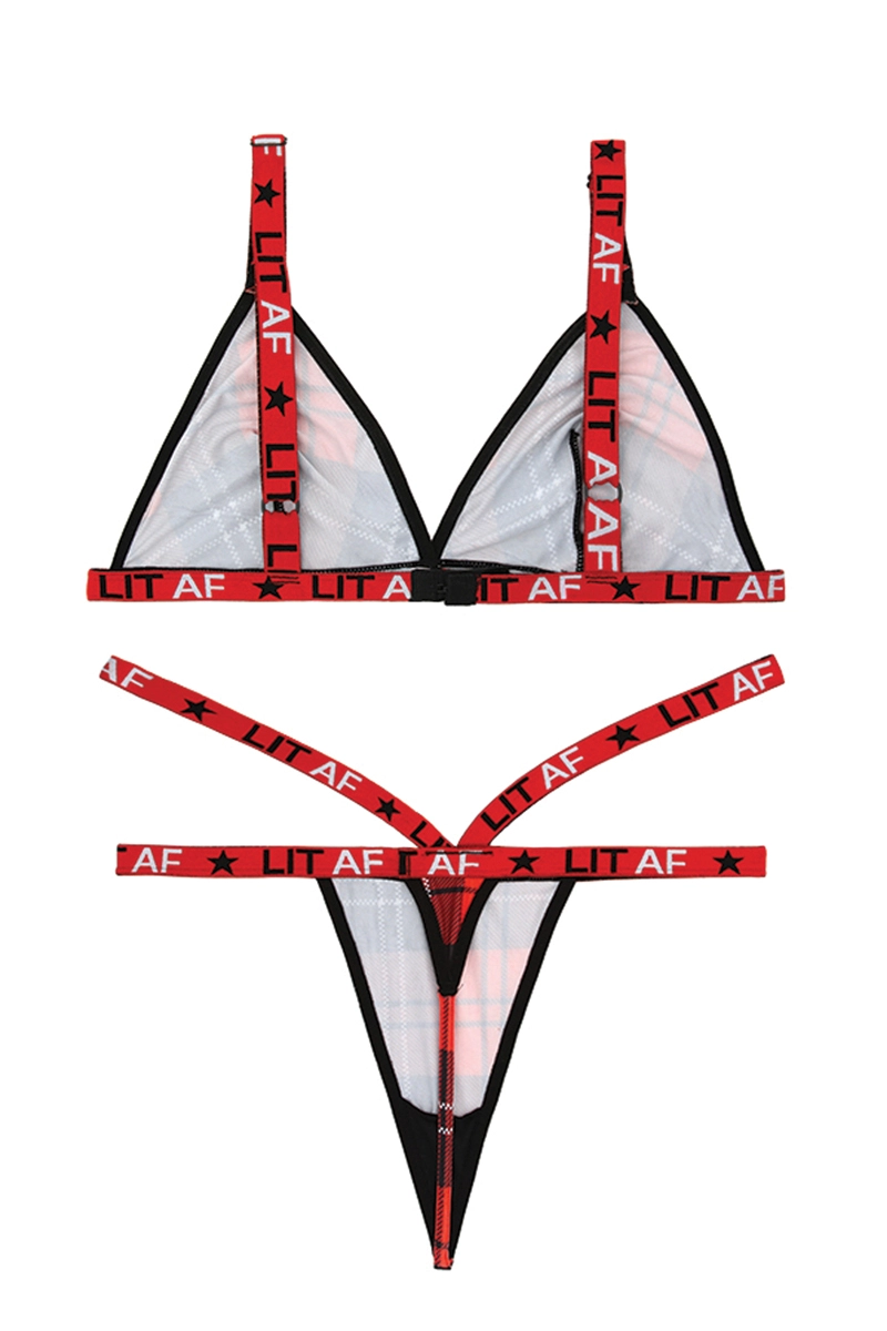 – Bralette carreautée avec une fermeture à crochet au dos et “LIT AF” imprimé sur les larges bretelles élastiques ajustables et sous le buste.