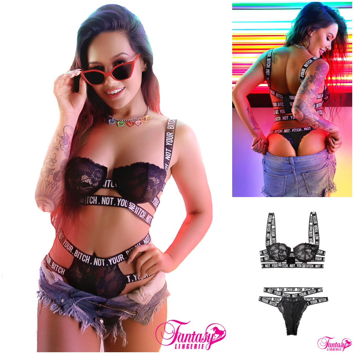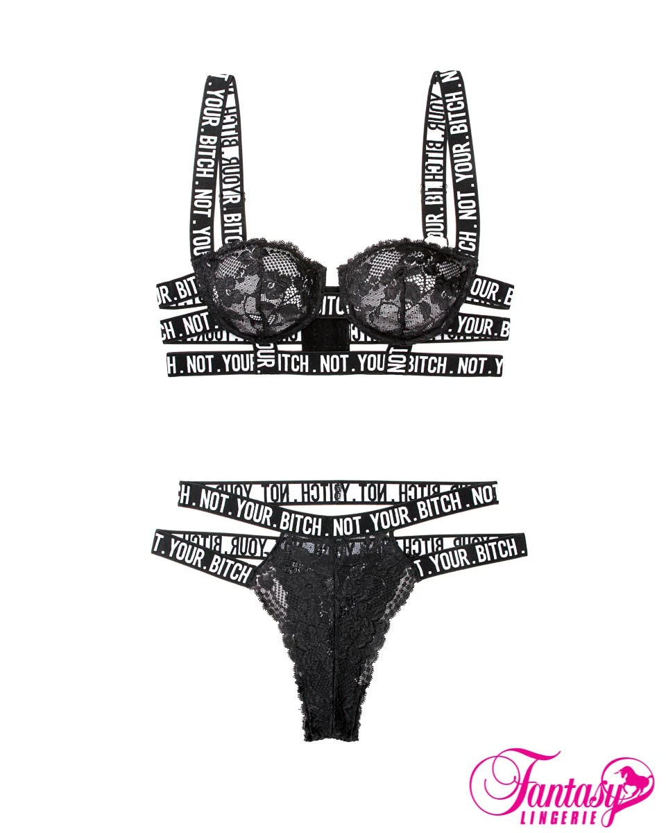 – Soutien-gorge en dentelle extensible avec des bonnets cerclés, trois fermetures à crochet au dos et “NOT. YOUR. BITCH” imprimé sur les larges bretelles élastiques ajustables et aux doubles sangles sous le buste.