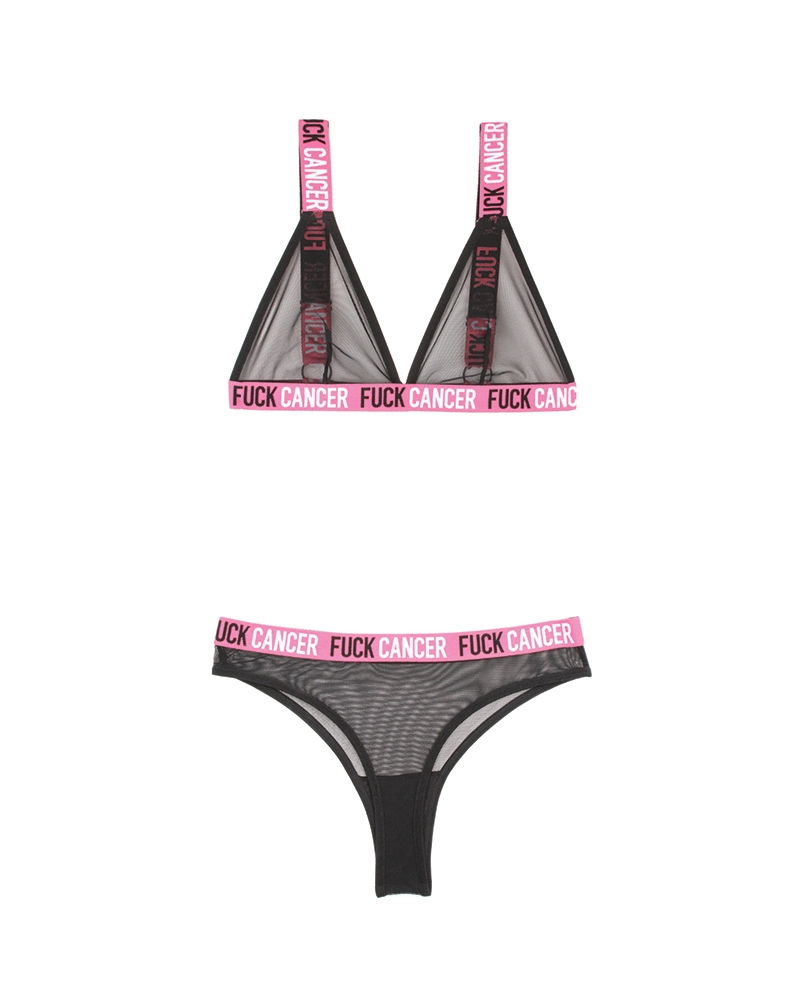 – Bralette en mesh transparente avec une fermeture à crochet au dos et “FUCK CANCER” imprimé sur ses larges bretelles ajustables et sous le buste.