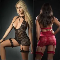 – Guêpière en dentelle avec un décolleté licou multi-sangles plongeant noué au cou, des jarretelles attachées ajustables, une ceinture en satin sous le buste comprenant une fermeture à crochet au dos et une fermeture éclair à l’avant