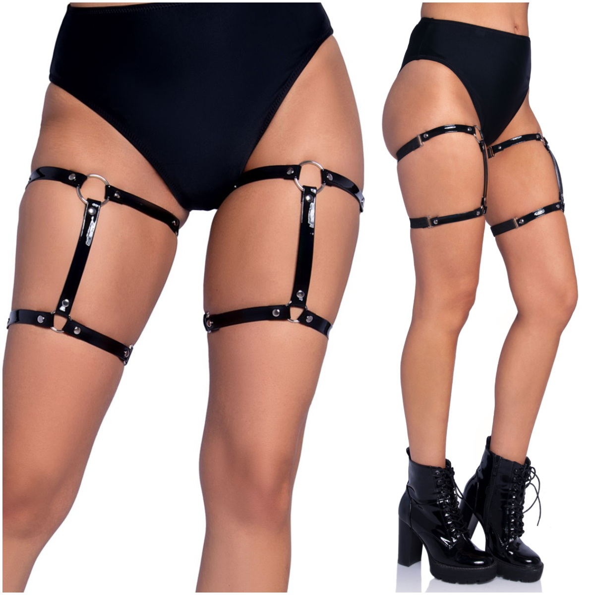 Ces jarretières de cuisse audacieuses présentent une conception en vinyle à double sangle avec un dos élastique antidérapant confortable, des détails de joint torique et des accents de clous. Ajoutez cette jarretière de lingerie à des costumes d’Halloween sexy ou à des tenues rave.