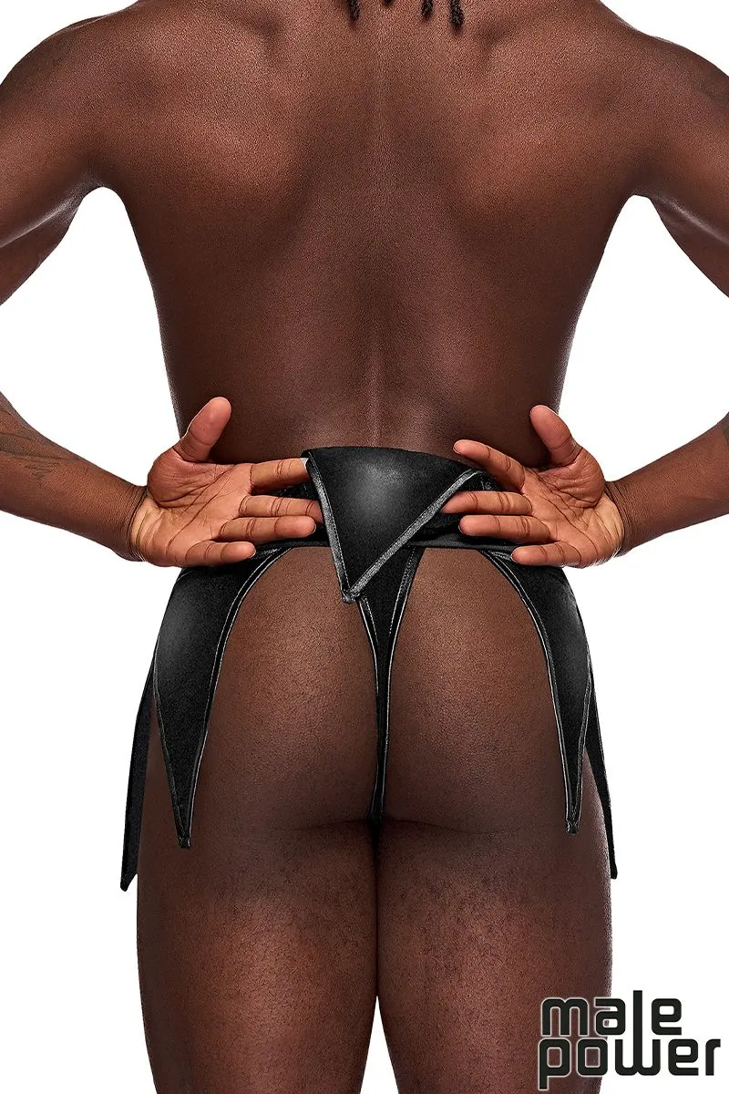 Kilt look gladiateur au look cuir extensible avec thong ouvert attaché, flaps triangles et clous métalliques décoratifs.