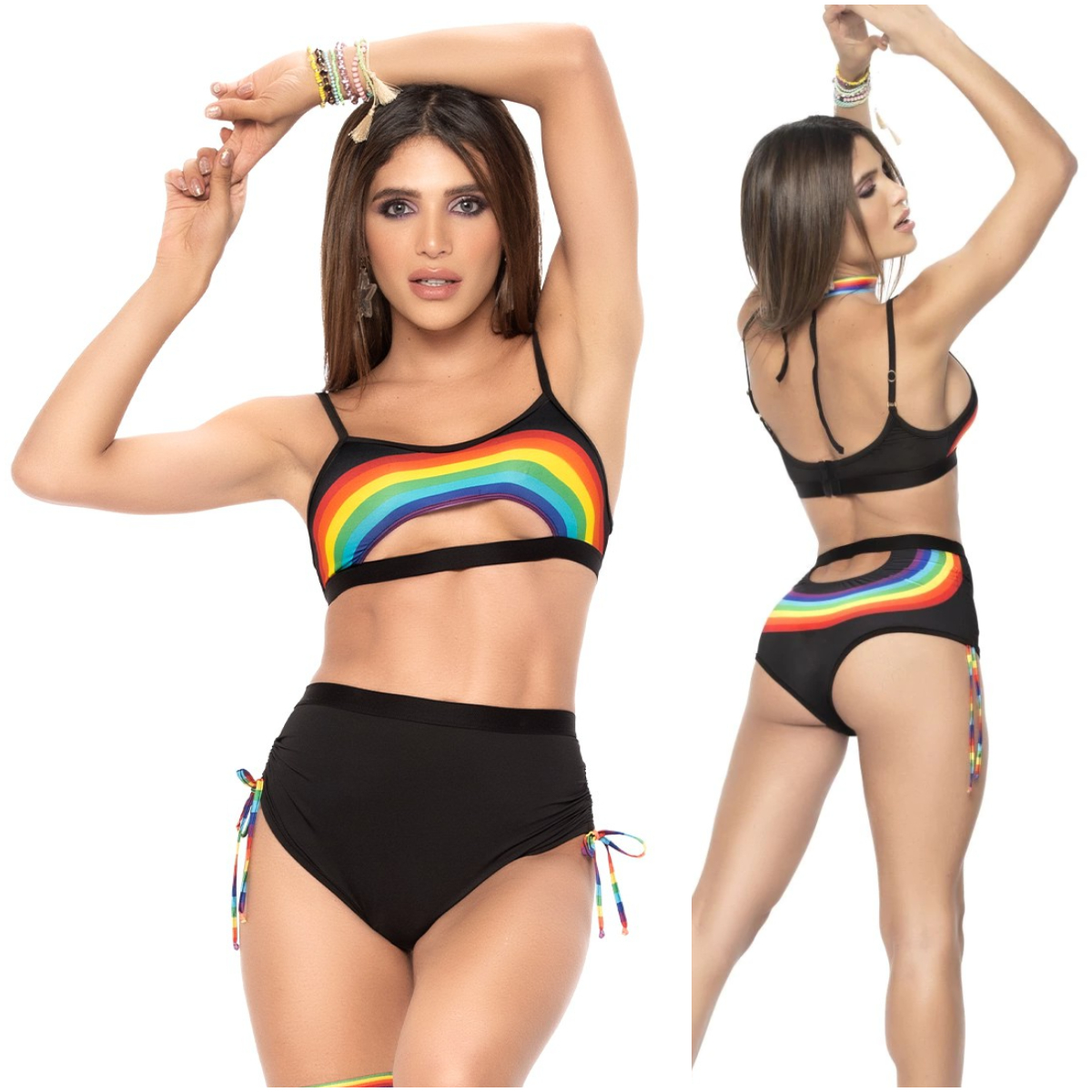 – Thong taille haute avec des cordons arc-en-ciel sur les côtés et une ouverture à imprimé arc-en-ciel au dos