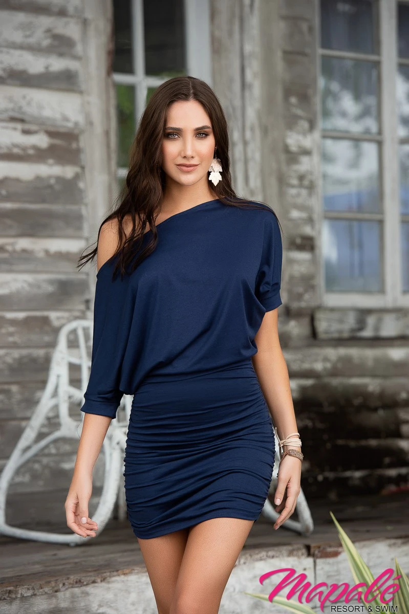 Robe élégante à manches courtes avec un décolleté à l’épaule, une jupe ajustée froncée avec un ourlet droit flatteur.