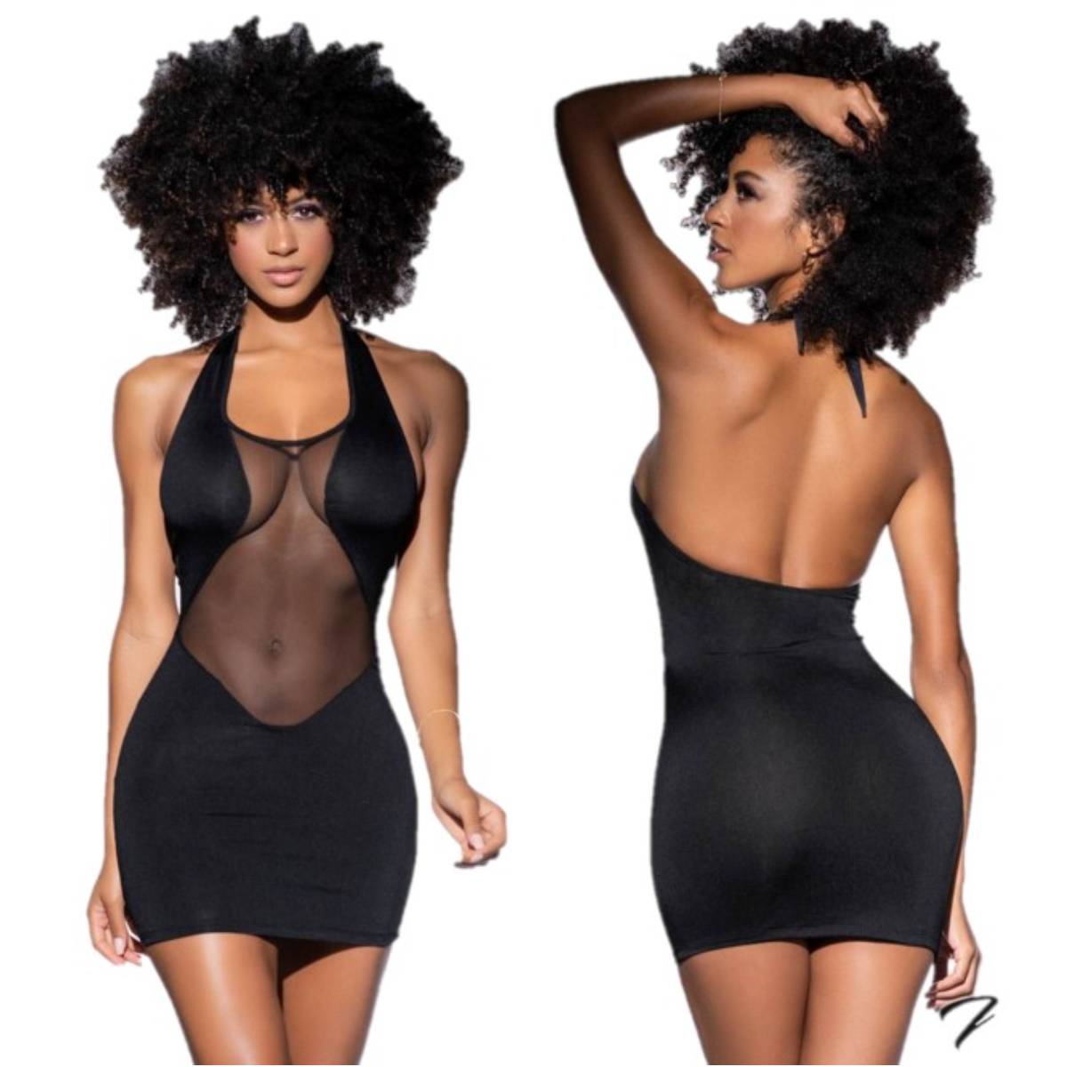 Robe opaque ajustée avec une insertion de mesh transparente plongeante à l’avant et au col licou noué à l’arrière du cou.