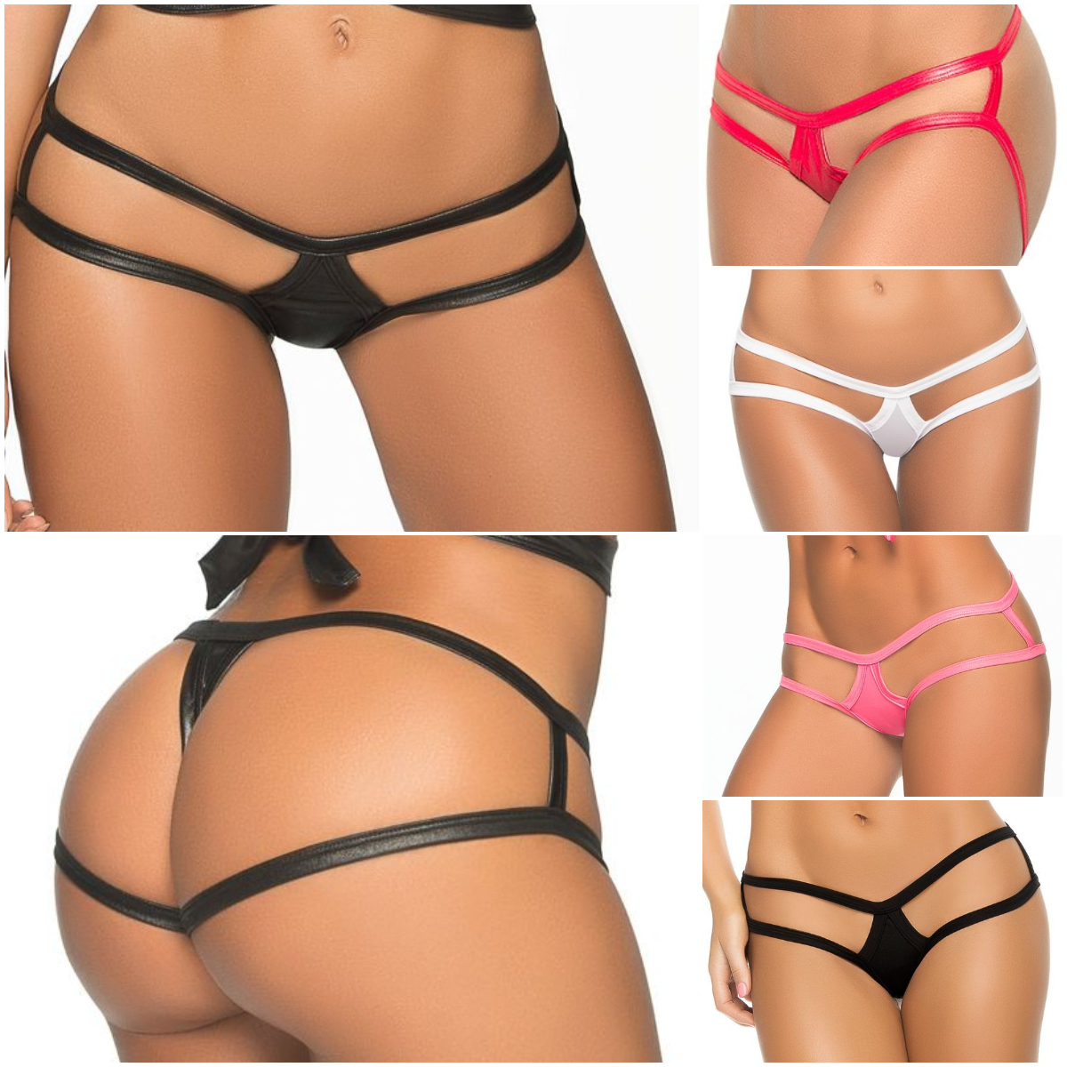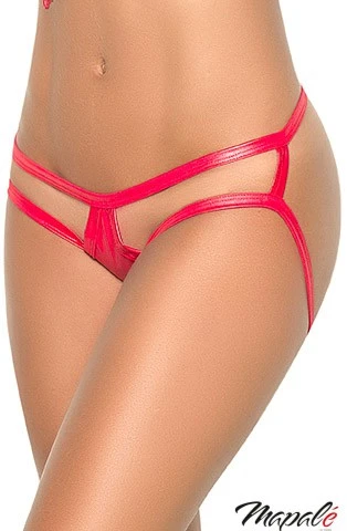 Culotte cage avec deux fines bretelles avant reliées à l’arrière du string, soulignant l’arrière.