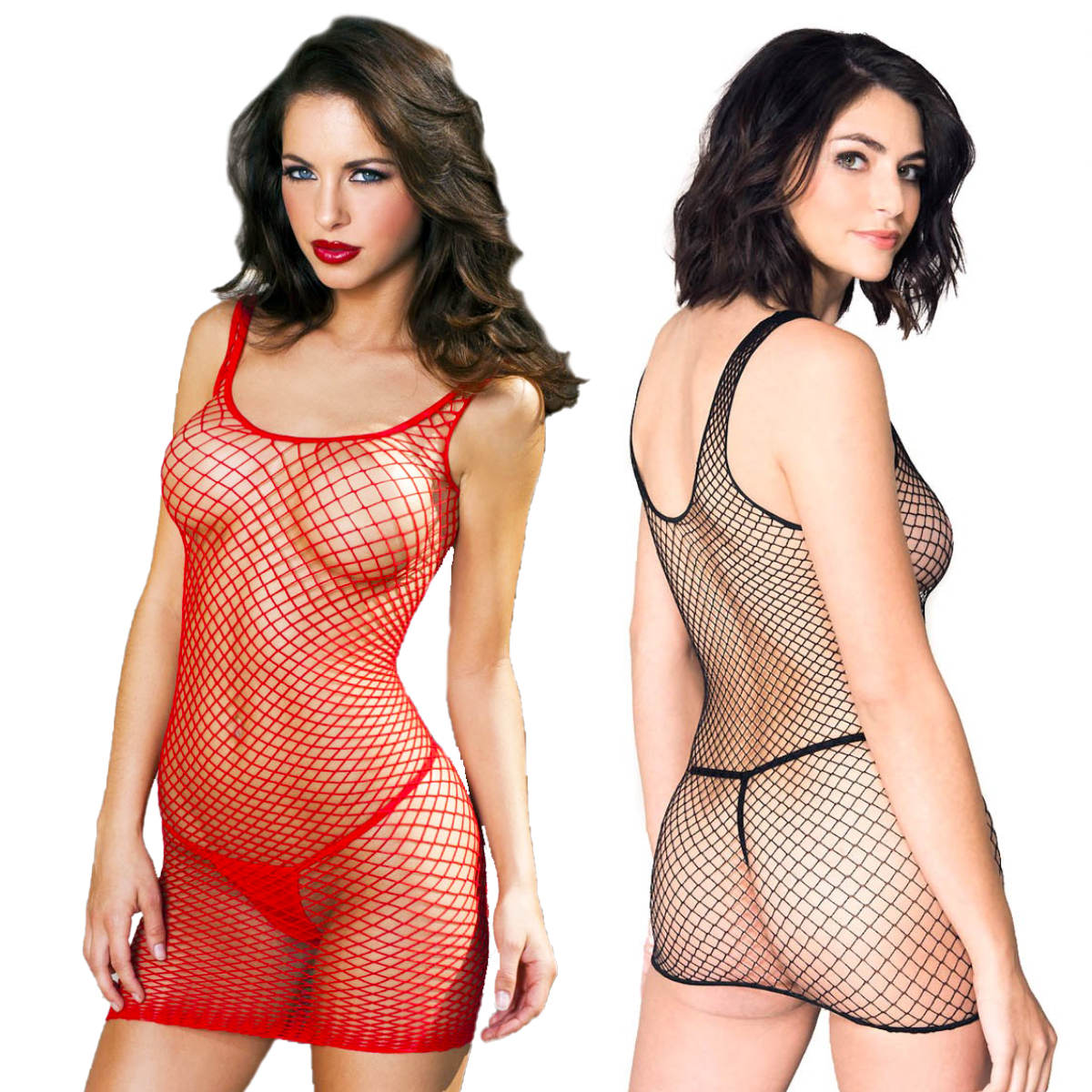 Mini robe en filet extensible avec de larges bretelles. (G-string non-inclus.)