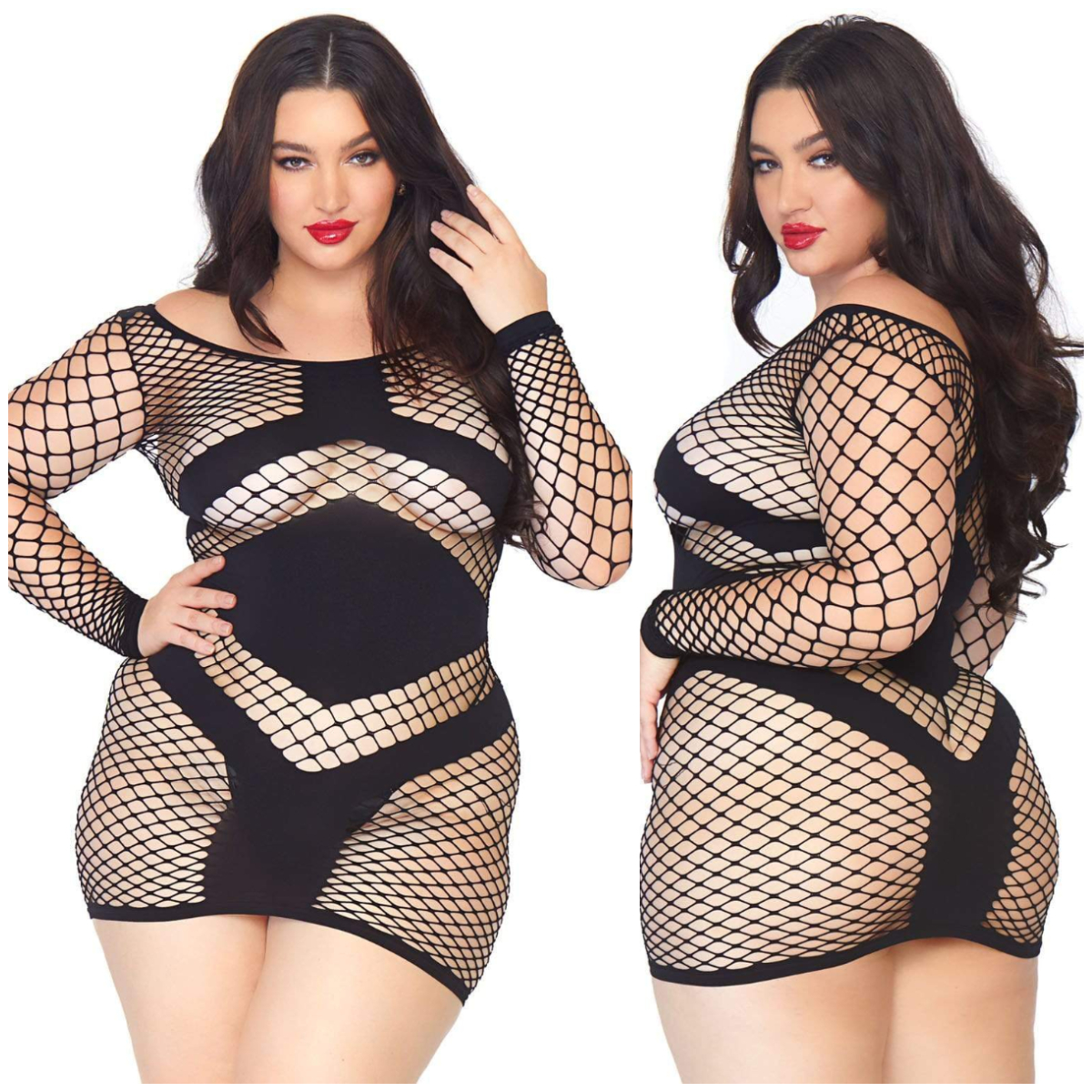 Une mini-robe excitante en filet de diamant avec un panneau opaque et une coupe moulante qui est aussi coquette que fascinante. Style col large. Matière extensible