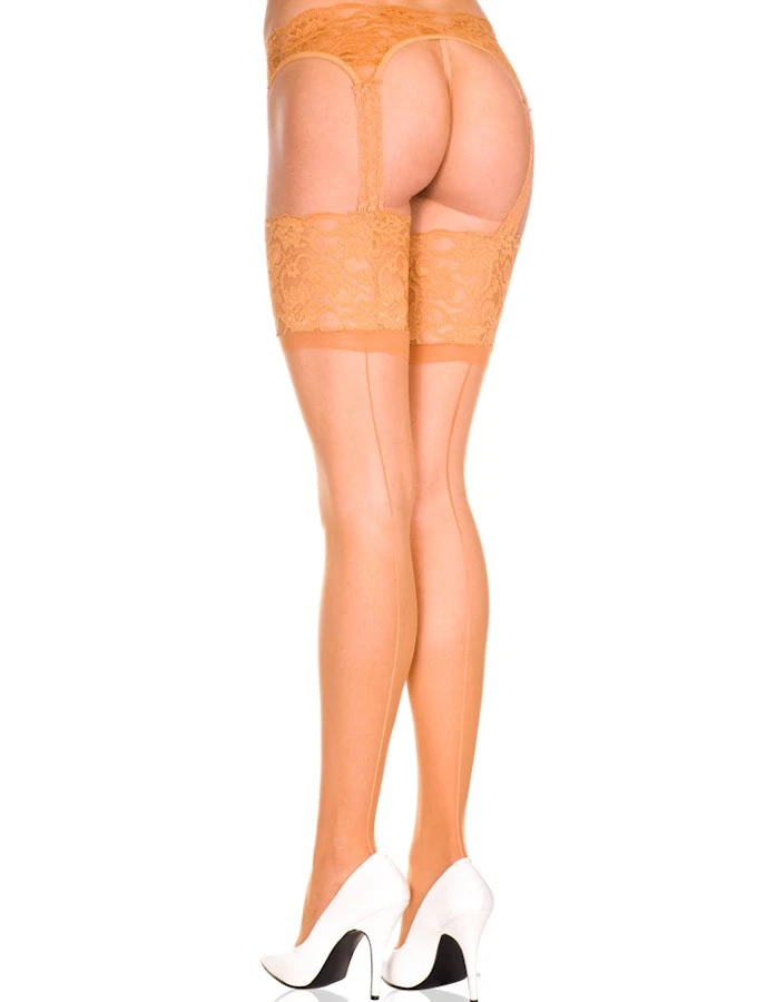 Porte jaretelle en dentelle cousu à des bas transparents avec haut en dentelle large et ligne au dos.