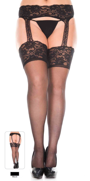 Porte jaretelle en dentelle cousu à des bas transparents avec haut en dentelle large et ligne au dos.