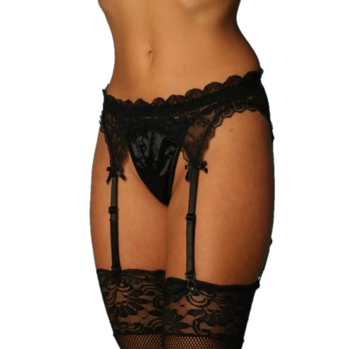Porte-jarretelles en dentelle festonnée avec dos et jarretelles réglables à agrafes.