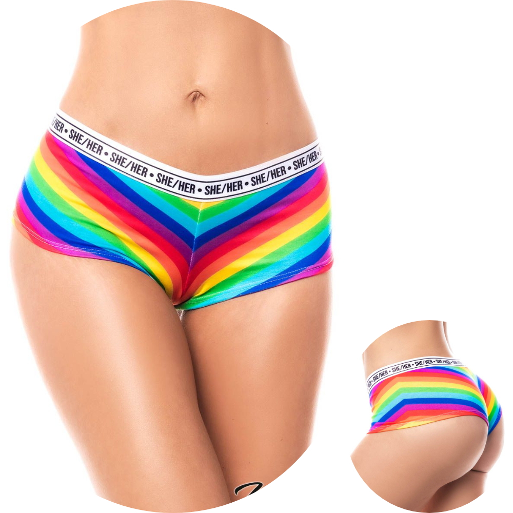 Culotte demi-fesse arc-en-ciel avec une large taille élastique comprenant un imprimé des pronoms désirés