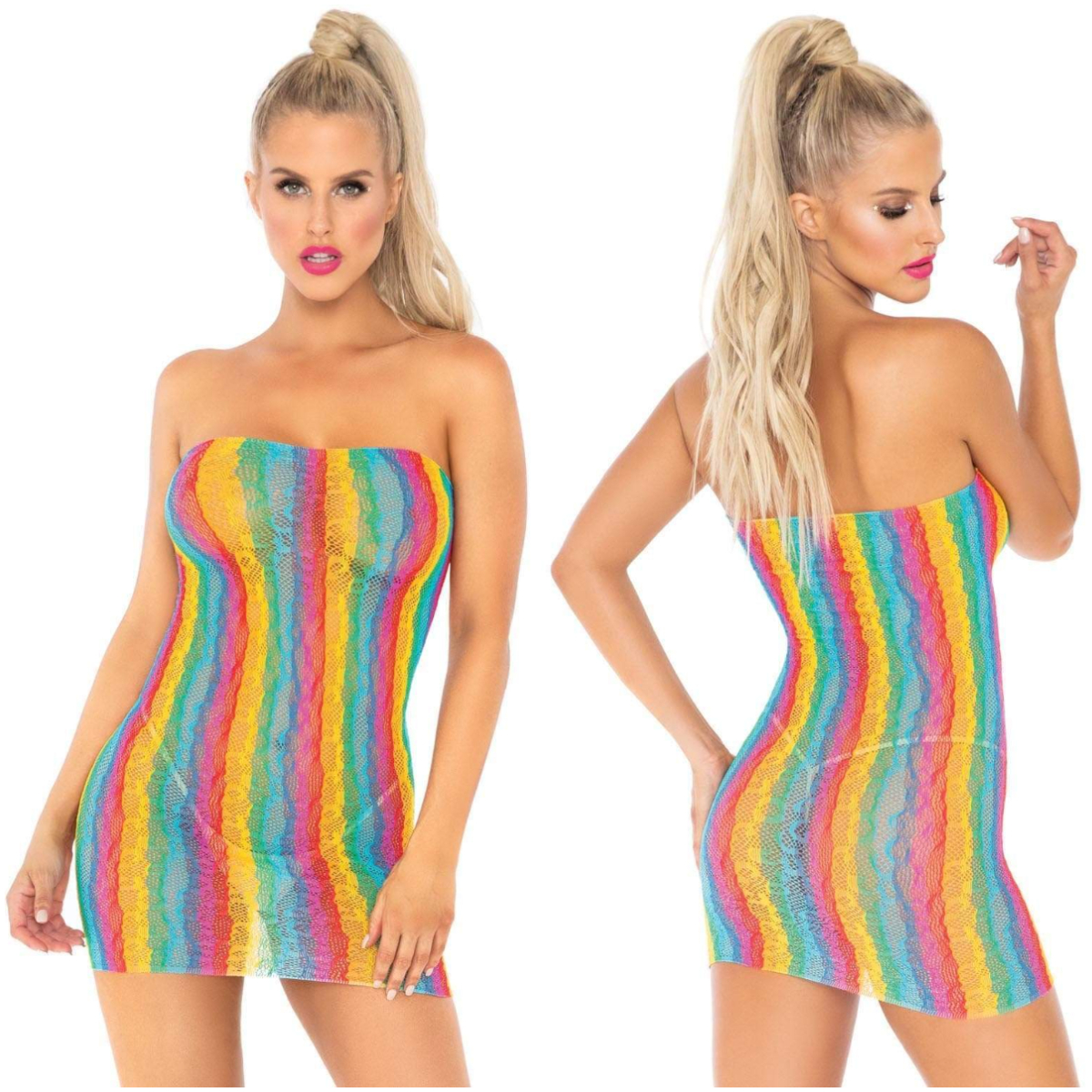 - Les couleurs vives de l’arc-en-ciel et la dentelle léopard accrocheuse forment une combinaison irrésistible sur cette robe sexy.