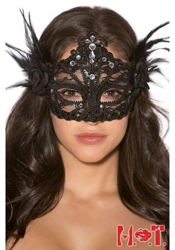 Masque de dentelle décoré de pierres au centre avec des plumes et des fleurs sur les côtés, noué à l’arrière par un ruban.
