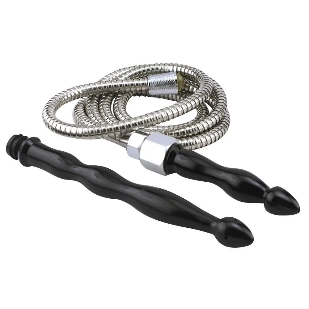 Le tuyau de lavement de douche avec deux buses est l’un des lavements de douche les plus simples. Un tuyau métallique de 6 pieds, qui se fixe à votre pomme de douche, et deux buses de lavement de différentes tailles, qui se fixent à l’extrémité du tuyau.