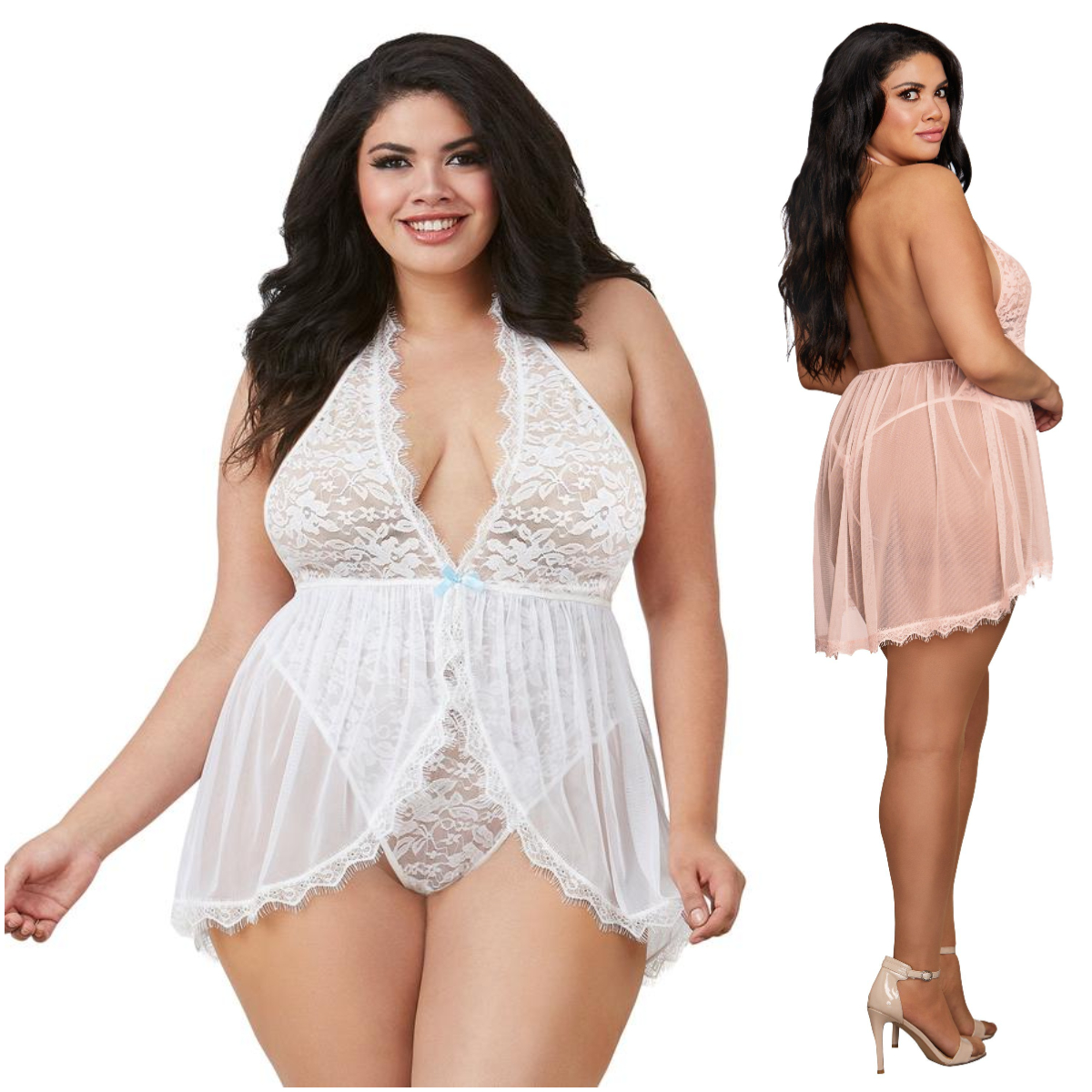 Teddy en dentelle extensible noué au cou avec un décolleté plongeant, une jupette attachée ouverte à l’avant bordée de dentelle frangée et un dos G-string.
