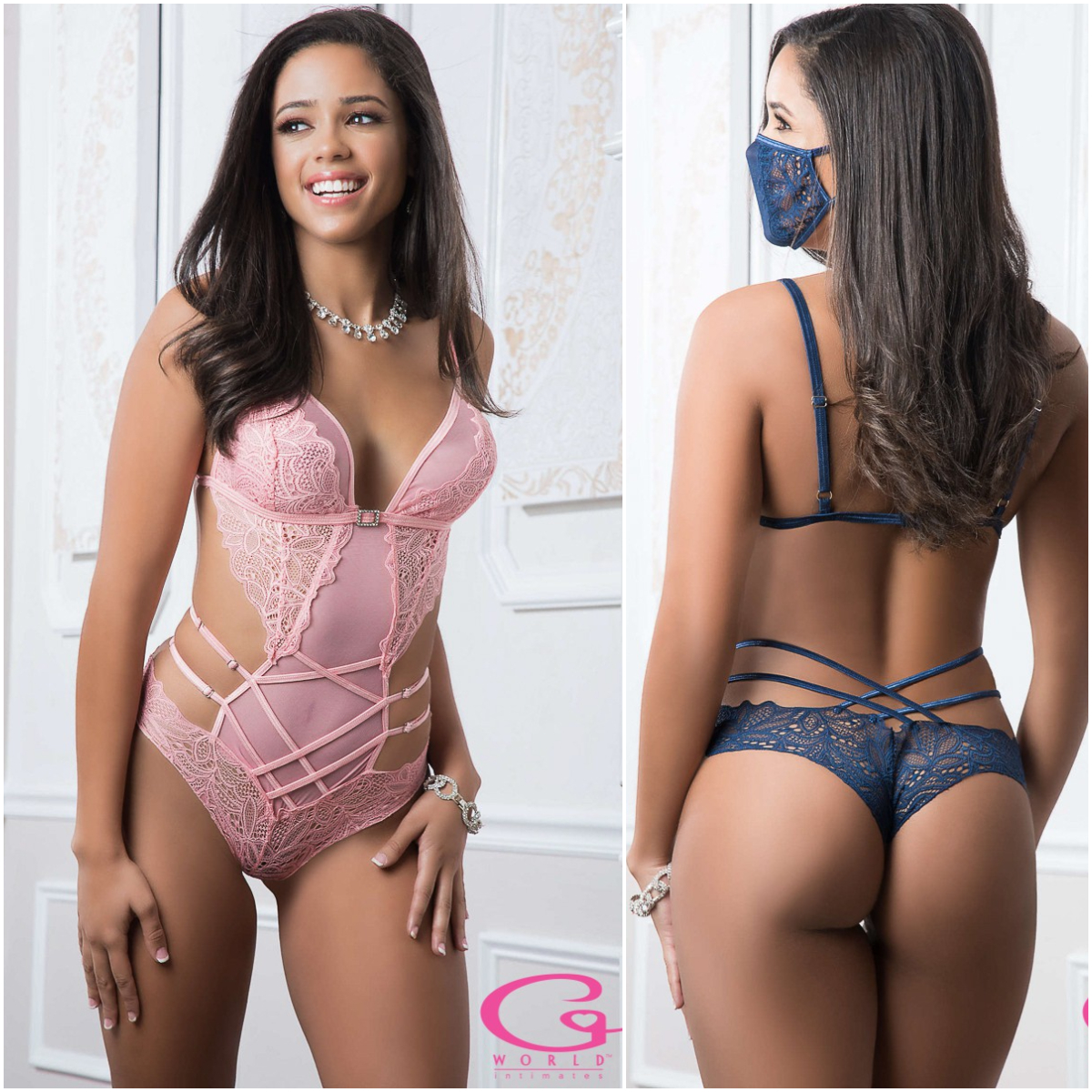 Teddy en mesh avec des élastiques ajustables croisés sur des côtés ouverts, des bonnets souples superposées de dentelle, des bretelles ajustables et une fermeture à crochet au dos. (Masque assorti inclus)