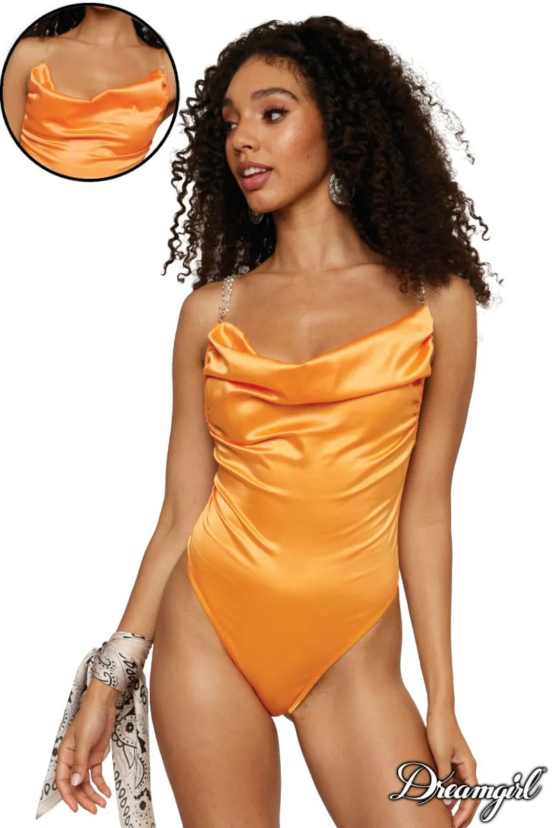Teddy en satin extensible au dos en mesh avec des bretelles amovibles à l’avant fait de larges chaînes dorées et à l’arrière transparent, un col châle et une fermeture à bouton pression à la fourche