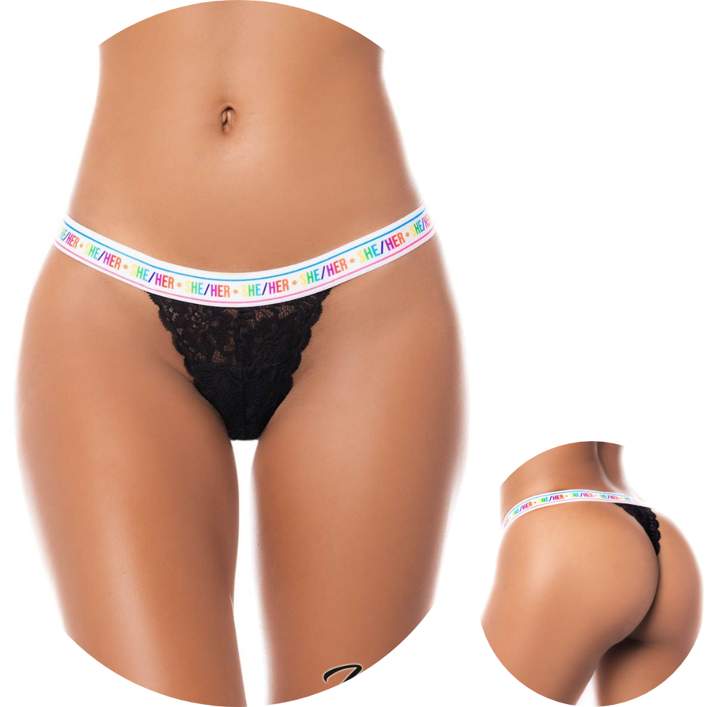 Thong en dentelle noire avec une large taille élastique comprenant un imprimé des pronoms désirés en lettrage arc-en-ciel