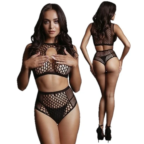 Ensemble deux pièces avec haut court et bas taille haute. Il a une combinaison de résille et de filet de clôture avec un trou de serrure. Cet ensemble est en partie stretch et peut être porté de la taille S à L.