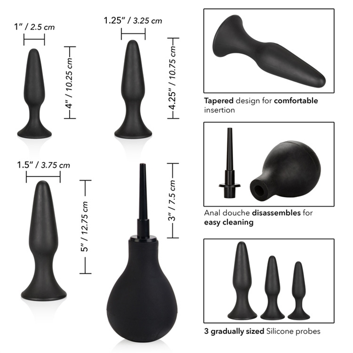 Ce kit comprend un ensemble de 3 sondes anales graduées et une grande poire à lavement pour vous permettre de profiter confortablement et en toute sécurité d’une stimulation anale passionnée. Nos sondes coniques en silicone vous permettent d’augmenter doucement la taille lorsque vous les insérez et que vous vous entraînez.